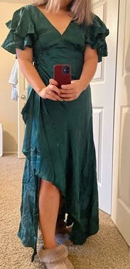 Perfect dress for a semi formal wedding. Classy with a little character. Lightweight silk in fun holiday-esque green. Side zip and bra clasps on top of sleeves to help with strap slippage. Nice set v neck without being over the top (was able to wear a regular bra) and shorts style spanx with no problem. Dress was not quite full length and has a slight a-line cut with the high low effect which was perfect - easy dancing!! Would rent again.