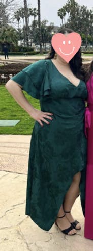 I definitely needed fashion tape to keep the shoulders & chestline in place, but overall it fit great & felt wonderful! I obviously sprained my ankle before my event so didn't get to wear the best shoes. It was unseasonably cold so I was glad for the bridal-style shawl I had made for myself. But back to the dress itself-the color was gorgeous & the fabric has a beautiful yet subtle flower design. I especially loved the asymmetrical design in the stomach area, which hides a problem area for me. I loved this dress!