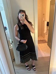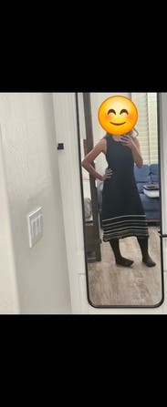 Wore this on a warm September night for dinner and drinks with friends. Very light, high quality sweater knit. Kind of perfect for September, when the bright colors and florals of summer don’t seem quite right but the temps are still summer-like. I’m short (5’2”) and it was a little long but not too long, even with flat sandals. Would absolutely rent again.