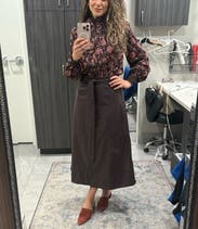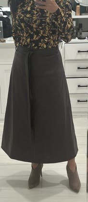 The skirt is beautiful - it’s comfortable and has nice structure. The color is is somewhere between a deep chocolate brown and a very deep maroon. I’m 5’4” and it didn’t quite flatter my proportions. I’m sure it will look beautiful on a taller frame.