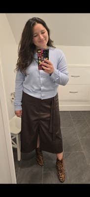I loved look of this skirt in hanger and material is gorgeous but it's so wide that I was swimming in it. Like giant bell skirt that felt overwhelming. Someone taller than 5'3 might enjoy this