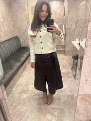 Loved this skirt so much. I think it rad a tad big and wish there was a petite option for sizing. It was a little long but looked fine with heels