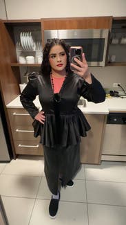 This skirt was great. With the leather you feel powerful in the skirt bc it's bold but with the black and style it's still versatile to wear for many functions. I wore for work. The waist is a bit big, the tie doesn't keep it tight enough and I'm a belly babe saying that. I lost some of the hourglass look bc couldn't get the waist to stay tight but still felt very good in it.