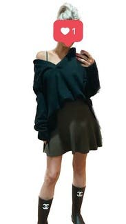 Flirty knit fall skirt. It’s fitted and will show your curves, in the back and in the front. I received a lot of compliments when wearing as part of the set.