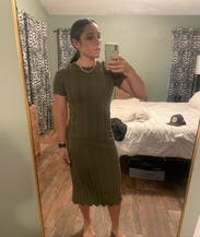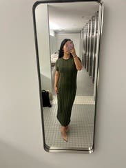 It is a beautiful knit dress! Wore in Houston and sat outside and didn’t die of heat! Beautiful olive color. Great fall piece. Would buy!