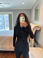 Soooo chic but simple. Never had a top like this before & felt so put together in it. Loved the fabric & how it laid on me & was form fitting while still looking obviously work appropriate. Loved the buttons too. The asymmetrical hem is cool but I don’t wear that length tops bc of my height so I wore it with super high jeans (11.5” rise) which met the split hem & over the last button so it tucked perfectly. Wish I had a pic!