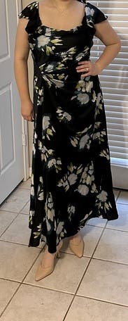 I wore this to a garden party dress code wedding. The dress was very comfortable to wear. I was worried about being too long and was planning to use fashion tape to adjust the hem but it wasn’t needed. I ordered both the 4 and 6, and went with the 4 as the straps didn’t fall down (like others mentioned in reviews the straps can fall). The 6 would have fit as well.