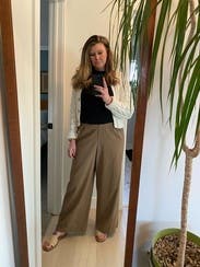 Lightweight and comfortable material that didn’t crease heavily after sitting for a while. I got these to wear to a conference where I was sitting for several hours and I was pleasantly surprised that they didn’t crease at the top of my thighs that meet my hips. I can’t tell you how happy I was with the length. I’m 5’10”, all legs, and these were perfect for me. I would assume short girls would need to wear heels and roll them up. I styled it with a white long sleeve shirt, blue backless flat loafers with gold buckle, an oversized gray suit jacket and chunky gold earrings. I felt great in the outfit.