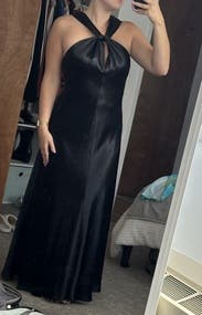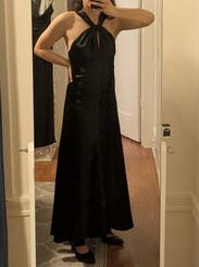 Awesome long black satin dress! Straps were a bit long but used small hoop earrings to cinch it and it was perfect