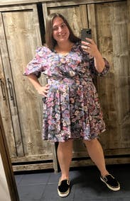 Cute pattern without being juvenile! Nice textured fabric. A little short but cute with tights. The bubble sleeves are about elbow length and the elastic isn’t too tight. The waist fits true to size, or just a little snug. Very fun with a leather cropped jacket!