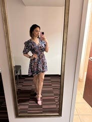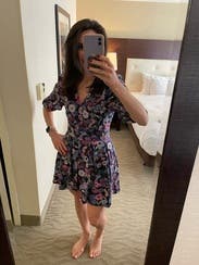 Enjoyed wearing this dress! If you have a small waist, might be a little loose. I might size down next time. Very cute!
