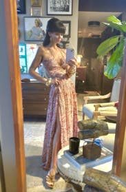 Wore to a beach club in Koh Samui it’s a great fit might not work if you have a big bust but lots of ways to tie the top to make sure it’s secure thigh slit is quite high but not very noticeable.