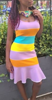 This dress is a great dress for curvy ladies. It hugs everything nicely. The weight of the fabric is thick and "sturdy" so you feel comfortable showing off your curves without it being too much. The ruffle at the bottom adds femininity to the dress. The bold pastel colors are bright and cheerful for spring or summer. Runs true to size.