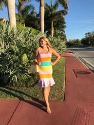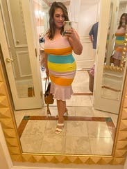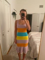 I was worried about the horizontal stripes, but the material holds everything tight. The colors scream summer vacation and cut is super flattering. Don’t hesitate to rent this one.