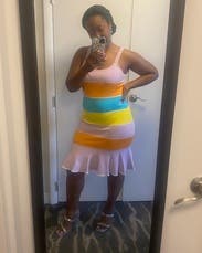 I wanted to rent this dress for months. Finally did and I regret it. It's very unforgiving; you can see the outline of my bellybutton in the dress lol but if you don't care about that, then go for it! Colors are gorgeous and the length is cute but just wasn't right for me. I ended up not wearing it.