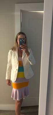 This dress was so fun and flirty. I got a ton of compliments all night. It was maybe slightly big in the straps, but that didn't deter me from wearing it. Knocked off a star because it shows every bump and lump. Styled with a jean jacket because it was a chillier evening than intended!