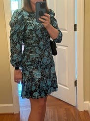 Loved the color. Flattering cut. Perfect length. Not too short. Sleeve is really cute with the slight puff. Wish the ruching on the front was a little thicker (like the back is), but Spanx helped. Wore dress with tall heeled black suede boots, perfect for fall weather. Would look cute with heels or dressy sandals in spring.