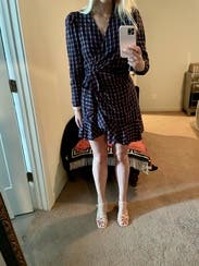 Somehow I didn't get any pics standing, but as you can see, this dress is a true wrap dress and is difficult to wear on a windy day. The colors are cute for fall and it's nice that you can adjust to your liking. I sized up one size from my usual six and was glad I did for the length but otherwise probably would have been fine with a smaller size. Overall it's cute but rather high maintenance, felt like I was trying to avoid showing too much, even with tape.