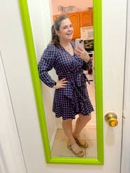 This soft wrap dress fit my curves easily and beautifully. Pink and Navy plaid with hints of orange. So cute! Perfect for work.