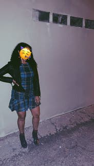 Loved the "punk" look of this dress. Sleeves were a bit too exaggerated for my liking (that's just personal preference though), so I paired it with a leather jacket. Ruching was super flattering to the stomach, but was a little baggier down lower by the crotch. I couldn't tell if this was because the fit had loosened because I'd been dancing for a while in a packed (i.e. hot) area, or if it meant I should have ordered the Size 4. (Honestly though, I don't think I would've been able to zip a Size 4 up over me lol, and if I had been able to, it likely would've been too short/skimming my butt).