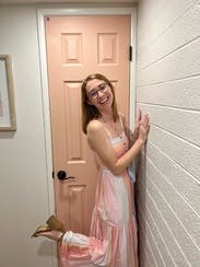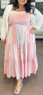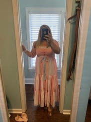 I was STUNNED by the beautiful colors and luxe details of this dress when it arrived, photos don't do it justice. Straps and waist are adjustable/tie, and the tiers of full fabric made me feel like I was swishing around in a princess dress. Kept it actually while sending back other items in my box. I'd buy if it was just a little more in my price range, but for now I'm happy to rent and wear a few more times!