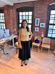 The Tanya Taylor Robbie Pleated Combo Dress combines a tailored, button-front bodice with a sharply pleated midi skirt for a structured yet easy silhouette. Pair it with heeled mules and a structured shoulder bag for warm-weather workdays or daytime events.