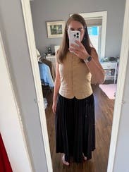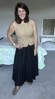 I love this dress. The vest and shirt together to make a put together dress is perfect for the office. Easy to throw on and go! Got so many compliments. I’m a bit larger chested and this was tight initially but it slightly stretched out while wearing. Will keep and wear for a few weeks!