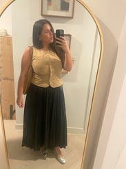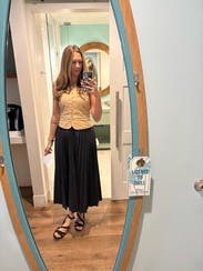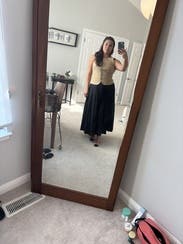 Super cute look for my winery day + the office. Love the movement of the pleated skirt. A little little tight if you’re bigger chested but I made it work.