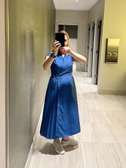 Side pleat detail is nice. I sized up for my second rental, this time in blue, which worked well. Great dress.