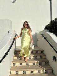 Got lots of compliments on this lovely number! Wore it to a September wedding in Santa Barbara. Felt really confident in it. I’d say it runs a little larger but I found that comfortable for a silky sheath dress.
