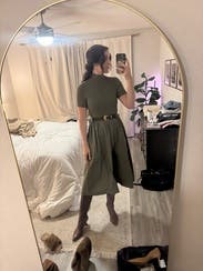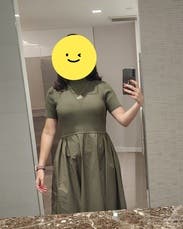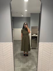 The dress is a beautiful olive color, and the length was perfect for my height. The contrasting textures of the top and bottom are flattering for the waist. I do wish it had pockets. However, there's a lot of excess material in the skirt, which can make it look a bit voluminous when sitting. Also, be prepared for a lightly wrinkled look.