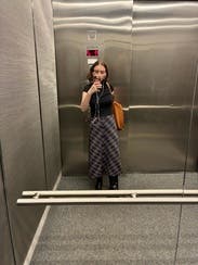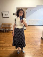 This Tanya Taylor skirt features a classic plaid pattern with a modern midi length, giving a preppy yet contemporary vibe. Pair it with a cozy knit sweater and ankle boots for a chic, everyday look.