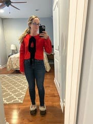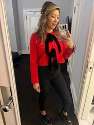 Super fun piece! The bold red color and black velvet bow add a playful touch. I wore it with a black mini, tights, and black boots. The red really popped and added the perfect touch of color. Got lots of compliments! You can easily dress it down with jeans for a more casual vibe. Fit-wise: I'd say it's true to size. However, I have wide shoulders, and it fitted perfectly, so if you have narrower shoulders, you might consider sizing down.