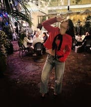 This vibrant red cropped jacket by Tanya Taylor features a bold black velvet bow, offering a playful yet sophisticated statement. Pair it with high-waisted denim for a casual yet polished look.