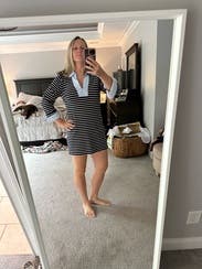 Got TONS of compliments on this one. The crisp contrast collar and cuffs give it a polished, preppy vibe, while the navy-and-white stripes keep it effortlessly chic. Whether you’re heading to brunch, a casual meeting, or just want to feel put together on a weekday, this dress nails that smart-casual sweet spot!