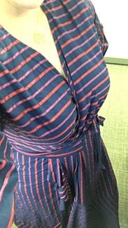 Loved this dress so much I bought it. It's a true wrap dress in a cute pattern. Wore by itself and with a cropped sweater. I often have difficulty with similar dresses being too low in the chest but this one had adequate coverage.