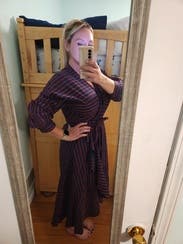 Wasn't sure about this dress at first as it sorta felt like wearing a robe and the fabric has a natural wrinkle to it, but after ironing a bit and adding a flashy necklace, I dug it. The ref and purple-ish colors in the Fant are more vibrant in person, too. I wore to work on Valentines and got several compliments.
