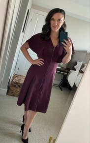 Stylish dress for work or weekend. It's hangs really well and moves in a flattering way from the cut of the skirt. Nice color for fall and the zip adds a bit of something different for work wear .