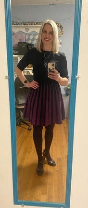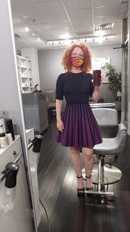This is a magical little dress. SUCH a flattering and forgiving shape, a little stretchy and a thicker fabric. Made me feel like a sorceress with the black and purple! Got a ton of compliments, just wish I'd had somewhere more exciting to wear it. Will need to rent again post-pandemic!