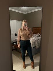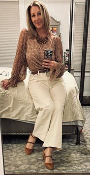 I loved this blouse! You cannot see it very well but the fabric has gold threads throughout that really make it pop. I paired it with caramel Spanx leggings and matching boots, then added a cream leather jacket. The sleeves are bell style but not intrusive like some other bell sleeve tops I’ve worn. Could be dressed up for a more formal dinner but I simply wore it to work and felt like a million bucks all day.