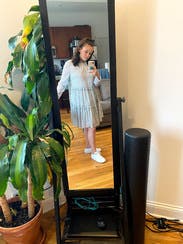 Rented this as a backup for an event and loved it so much that I ended up wearing it to a casual dinner a few nights before just so I could wear it once! I dressed it down with a jean jacket but you could also easily dress it up. Really comfy and flattering. I loved the neckline and sleeves. The material has a little stretch so you don't feel suffocated at the neck. The skirt is pretty full and flouncy, so don't expect a fitted dress. Would recommend!!!