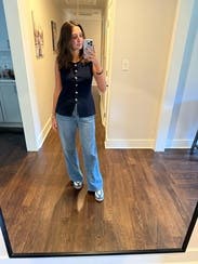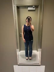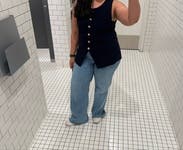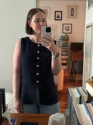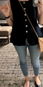 I love this versatile navy vest! I didn’t notice from the pictures, but it has interesting buttons that give it an elevated look. The silhouette is very flattering, and the fabric is thick with some stretch, very comfortable. Fits TTS.