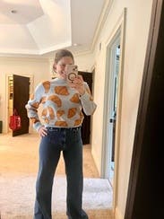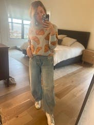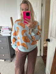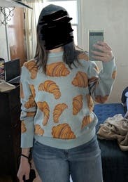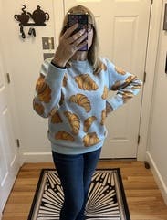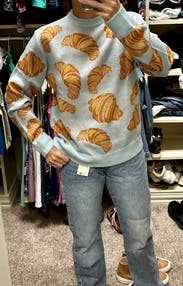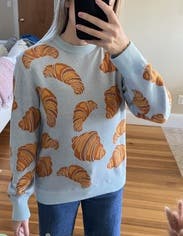 Who doesn't love croissants? I wanted to buy this but it's expensive. The light blue color background was perfect for the croissants print and I got so many compliments on it. The fit was just a standard crew neck light sweater but the fun print makes it so much more. Would definitely rent again!