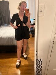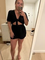 Loved this romper! Wore to a bachelorette party. Great fit except a little short - I’m 5’1” and sitting/bending over was dicey. Fabric does wrinkle easily and wasn’t my favorite but still loved the look.