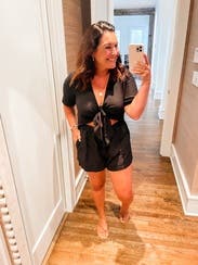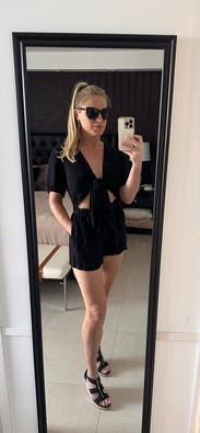 Second time renting this romper and it's very cute to wear either during day for a day party by the pool or in the evening with heels. Hard to wear a bra and have it not show with the tie in the front.