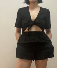 The fit of the shorts is so high and weird and the tie made my chest look sad. I don’t know if it was too big or too small or if I needed bigger, perkier boobs; this just didn’t fit me right. I’m not sure who this would fit.