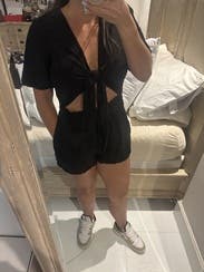 This romper is SO comfortable and flattering! Didn’t have to wear a bra. The tie holds the girls in place. My one qualm is that my larger bottom filled out the shorts TOO well, so I did have to untie the top and go to the bathroom half naked instead of shifting it to the side like I can with looser rompers. But for how good it looked, I was willing to make the compromise.