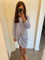 Such a lightweight dress for summer. Off center tie/knot is interesting & can be adjusted a bit (more fabric tied in tighter), if desired. I found it quite loose. Size down for a more fitted hourglass look. Described as denim but felt a lot thinner to me. I wore with heels for work and white Converse for a Sunday drive & lunch. Length was great for for my short height. (July 2022)