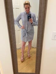 Loved this dress, especially once I figured out there is a small button on the inside of the dress to keep everything in place. It’s easy to wear and the tie detail makes it more interesting than a basic button up shirt dress.