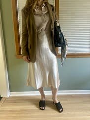Throw it on over anything and suddenly you’re professional. Color goes with almost anything. The style is big and I liked wearing it with tighter fitted dresses.